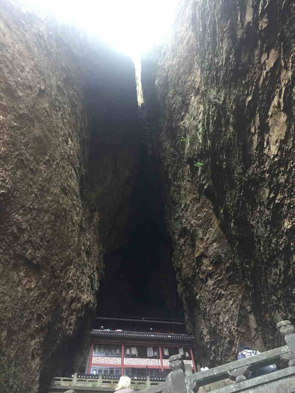 28日早上我們乘車赴北雁蕩的靈峰景區(qū)。一路上,大家談笑風(fēng)生,抑制不住興奮的心情。到達(dá)目的地以后我們首先去的是合掌峰。合掌峰是雁蕩山的代表景觀之一。峰內(nèi)的觀音洞建有九疊危樓,建筑極具匠心,與天然洞穴之美融為一體,為雁蕩山第一洞天。觀音洞隱于合掌峰中,洞高113米,深76米,寬14米,洞中累有九層樓閣。太陽正照洞底大殿,每天才數(shù)分鐘。觀音洞為雁蕩山第一洞天,深藏玄機(jī),經(jīng)年香煙繚繞。