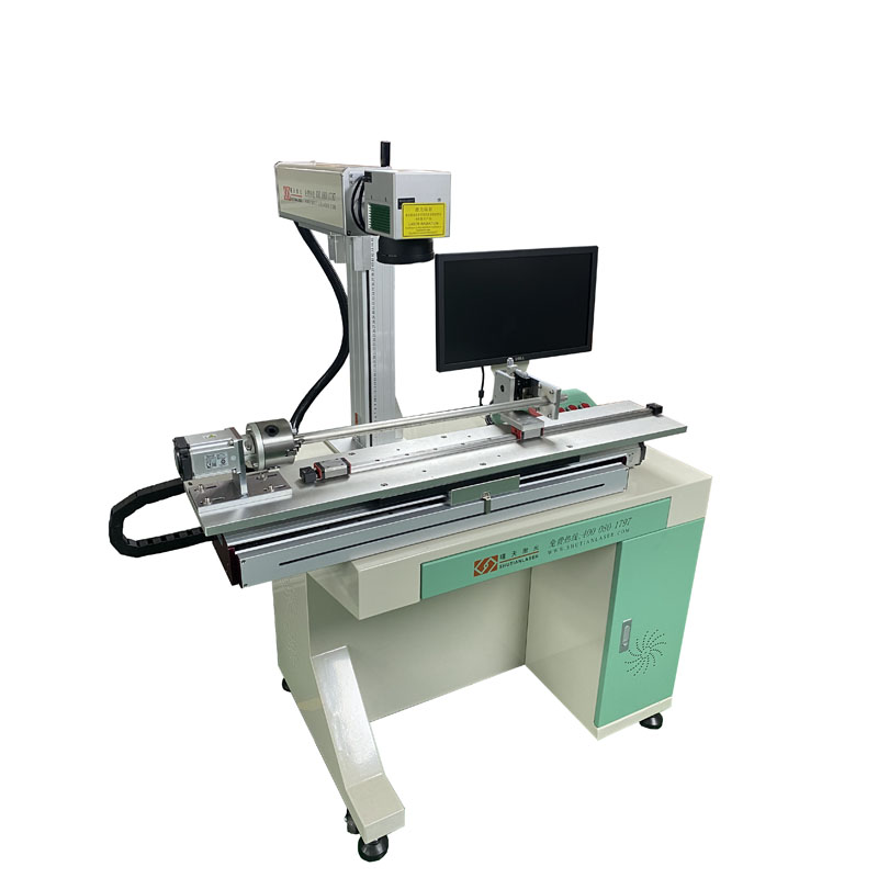 上圖為我司專為客戶定制的光纖曲面激光打標機,該設備在標準辦公桌式機臺上改造,