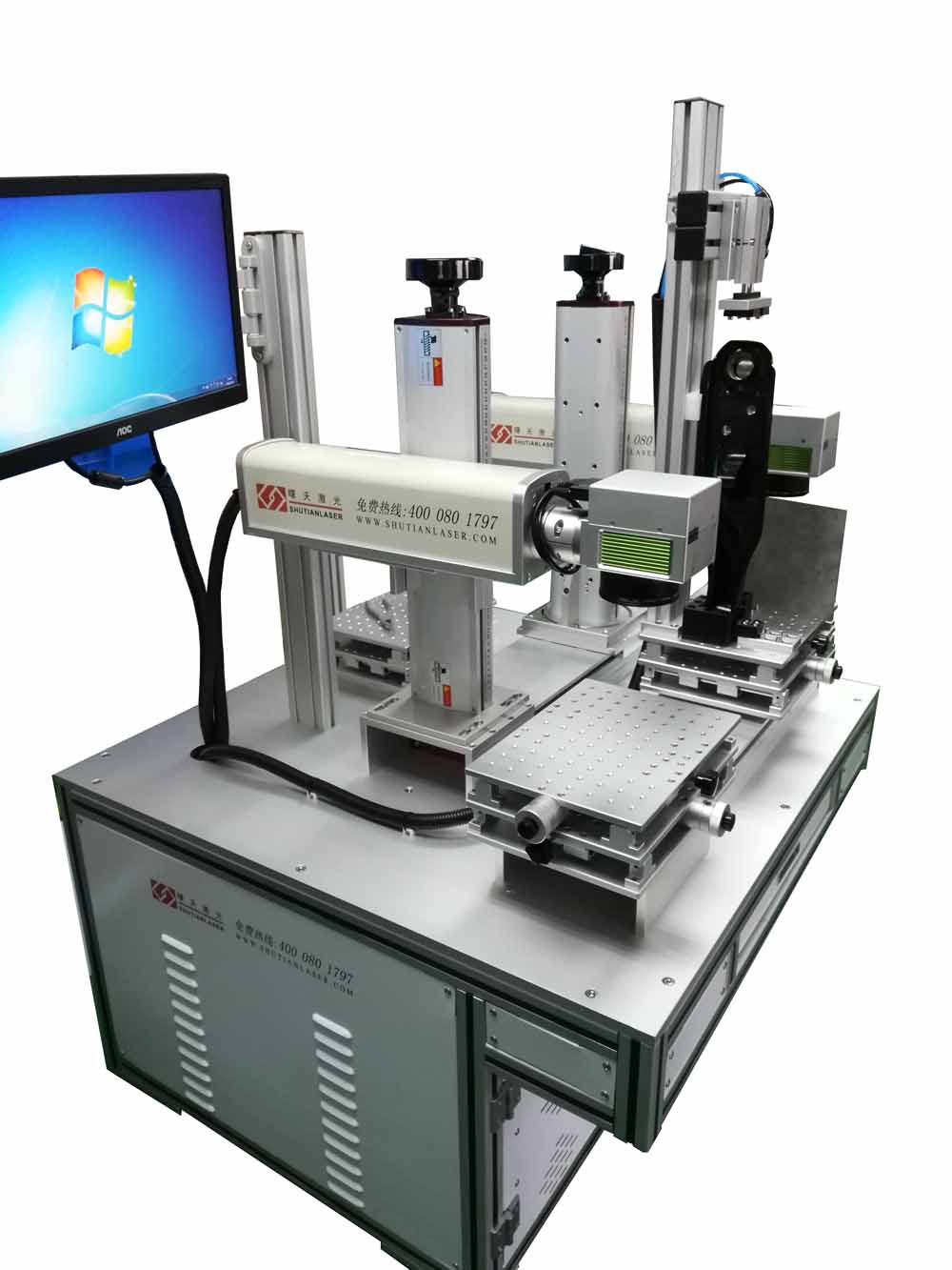上圖為我司專業(yè)研發(fā)定制的雙頭光纖激光打標(biāo)機(jī),該設(shè)備專用于汽車配件打標(biāo),能在產(chǎn)品表面,正反面同時(shí)標(biāo)記不同內(nèi)容,大大提高了生產(chǎn)效率。三個(gè)工作臺(tái),滿足了不同型號產(chǎn)品同時(shí)打標(biāo)的要求。