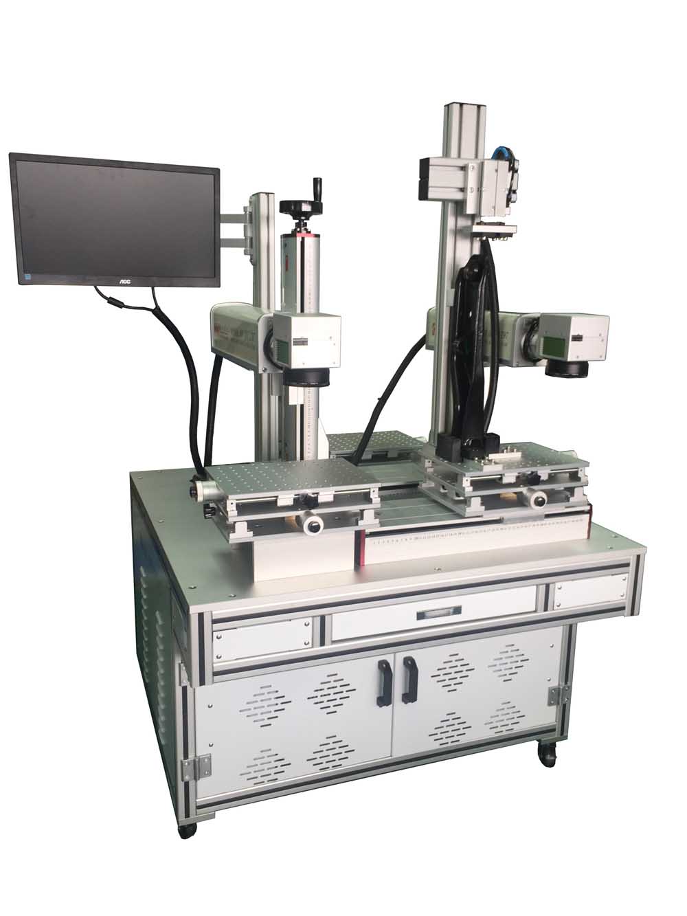 上圖為我司專業研發定制的雙頭三向光纖激光打標機,該設備專用于汽車配件打標,能在產品表面,正反面同時標記不同內容,大大提高了生產效率。三個工作臺,滿足了不同型號產品同時打標的要求。